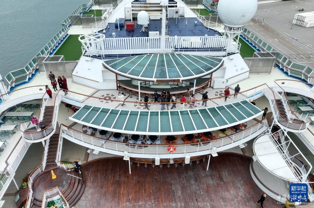 3月6日,旅客在“梦想”号国际邮轮上参观(无人机照片)。