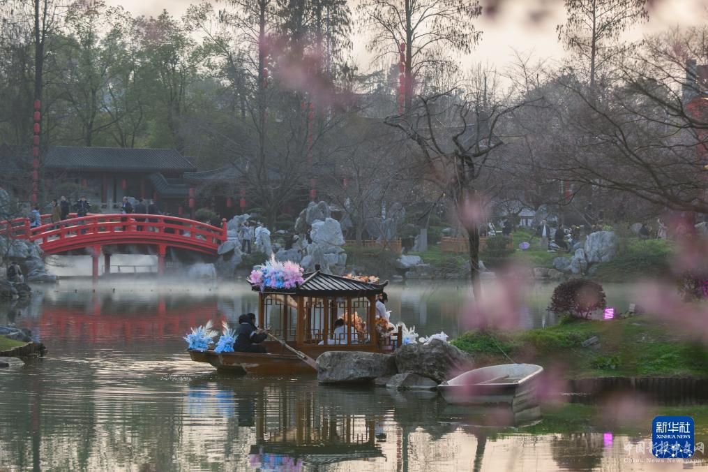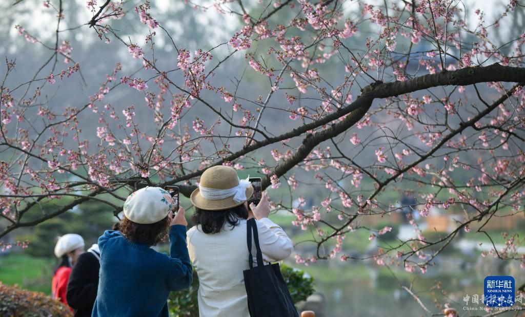 当日,2024武汉东湖樱花节开幕,东湖樱花园内樱花初绽,吸引游人前来赏花观景。