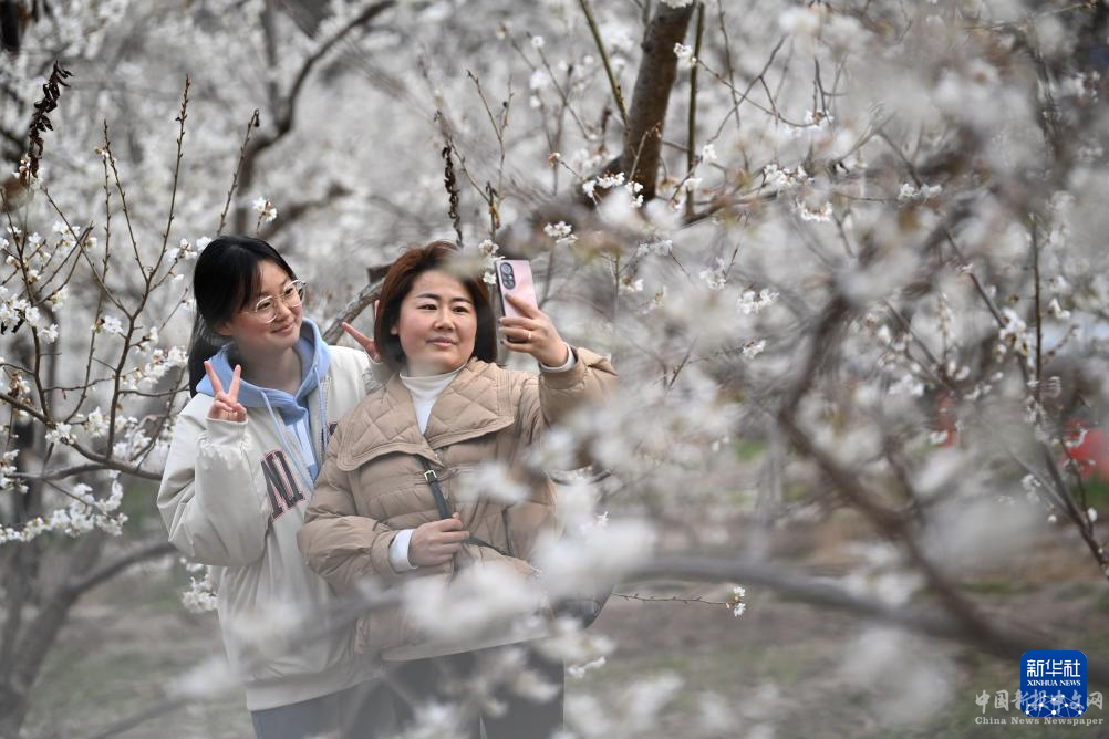 3月9日,两名游客在陇南市武都区城关镇石家庄村的樱桃树下拍照留念。