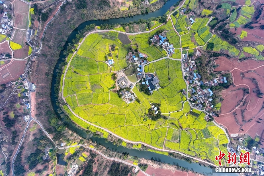 3月9日,四川省仁寿县青岗乡盘龙村“菜花坞”油菜花绽放,游客纷至沓来,感受春天里的田园风光。图为空中俯瞰盘龙村金色的田野。(无人机照片)