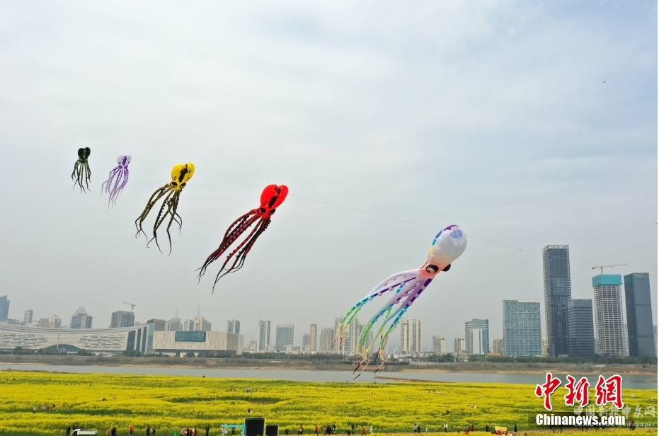3月9日,在江西省南昌市东湖区扬子洲镇三联村裘家洲滩头,放飞的巨型风筝。当日,南昌市裘家洲金花节、风筝节、帐篷节三节同启,不少市民游客前来赏春踏青。(无人机照片)
