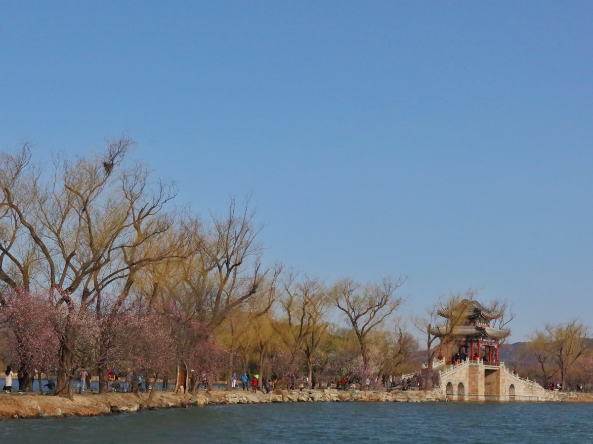 3月17日,颐和园西堤盛开的山桃花与柳桥相映成趣。中国日报记者 姜东 摄