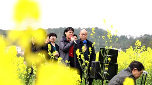 在一位“乡里通”的带路下,采风车队又转过弯弯的长湖岭山路,迅速来到当年明朝尚未发迹的大学士、后来的朝廷大将熊廷弼与省参议王三命以诗结友的笔武仓下桥头,继续车轮滚滚,一路西上,只费半刻多钟的时间,采风团便来到了传说出过皇帝的地方--龙泉村大竹垅中。这是一个四面青山环抱,中间呈现似宝葫芦状的中型之垅,垅中遍野油菜花灿若金花,皇坪公路从中穿过,红楼式的龙泉村部建于北边山脚中央,四周白墙彩瓦的乡村别墅环山而建;沙江从南边流过村庄,留下多个“小桥流水人家”的诗情画意美景。随着向导的一声“下车”令,车队又戛然而止,开始了第二个点的采风。这时,极其创意的“梅城摩旅”队员们,将一套随车而带的音响设备,七手八脚地搬进了田野油菜花丛中,手至音起,花中立即飞出了“家乡美”“故乡情”……一支支悦耳动听的优美歌声,男女队员们随之闻歌起舞,瞬间将寂静的田野变成了一场别出生面的文艺晚会,吸引附近村民赶来观看。特别是一位花甲之龄的队友,手握话筒,背伏一部唱歌机,一边唱,一边跳,将一首首优美的歌曲带入花海中,身后跟随的队友,随歌跳起了翩翩手似柔柳般的舞蹈。