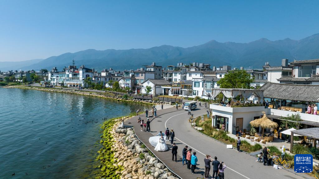 人们在大理市洱海边的生态廊道游玩(无人机照片,4月14日摄)。