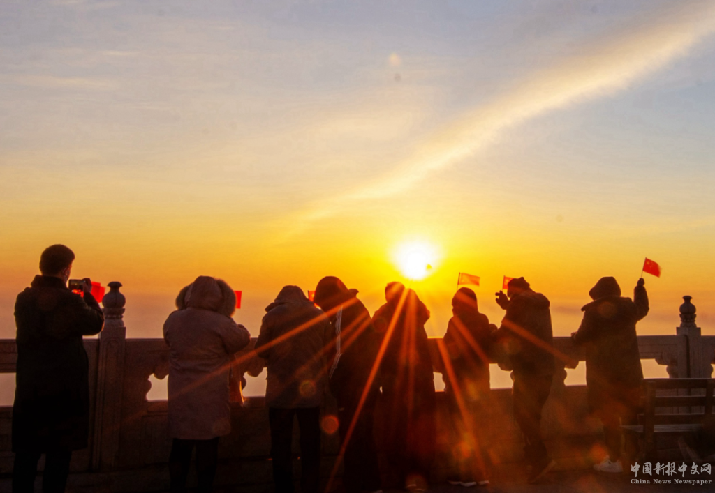 游客在山东省临沂市沂蒙山银座天蒙旅游区观看日出(2023年1月1日摄)。新华社发(武纪全 摄)