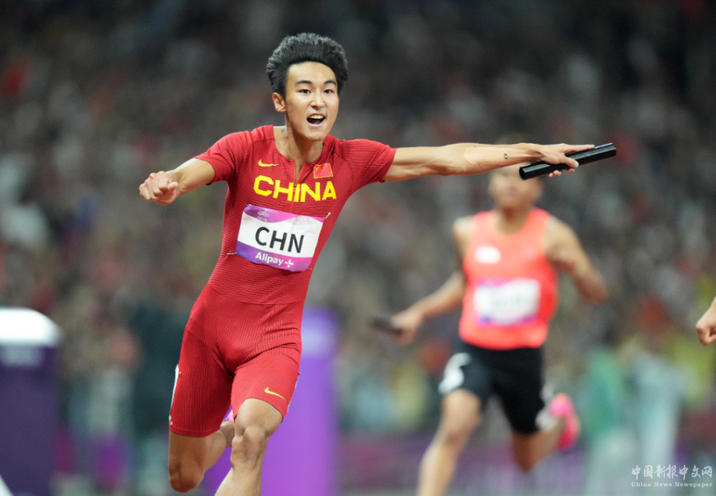 2023年10月3日,中国选手陈佳鹏在比赛中冲线。当日,杭州亚运会田径项目男子4x100米接力决赛在杭州奥体中心体育场举行。中国队夺得冠军,日本队获得亚军,韩国队获得季军。新华社记者 孙非 摄