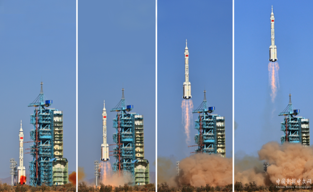 这是神舟十七号载人飞船发射升空过程(拼版照片,2023年10月26日摄)。新华社记者 李刚 摄