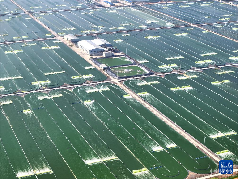 在广西防城港市港口区企沙镇山新村的微藻养殖基地,轮桨机在一条条微藻跑道式养殖池内拍出白色水花,构成一曲水上“乐章”。