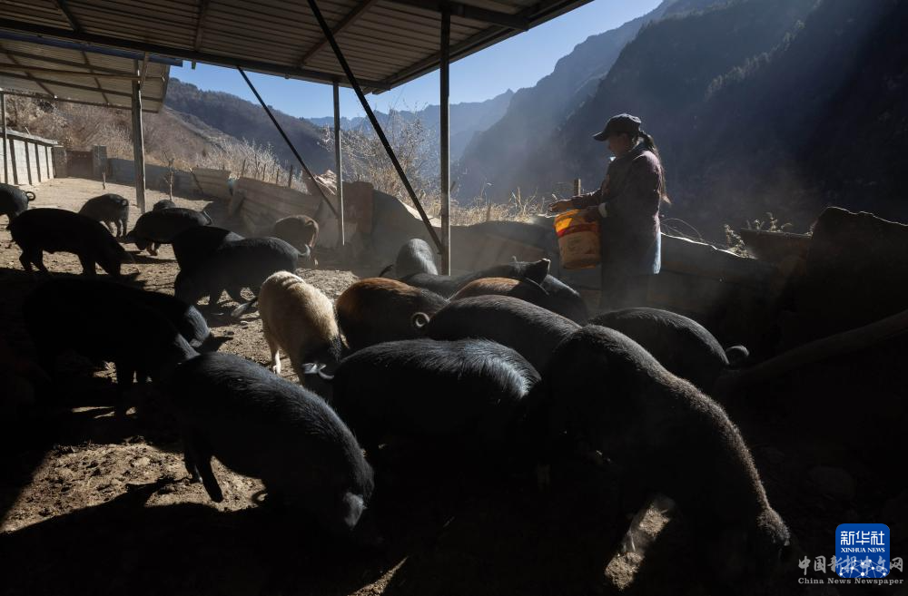 1月10日,在茂县赤不苏镇后村,羌族妇女杨继英在喂养藏香猪。