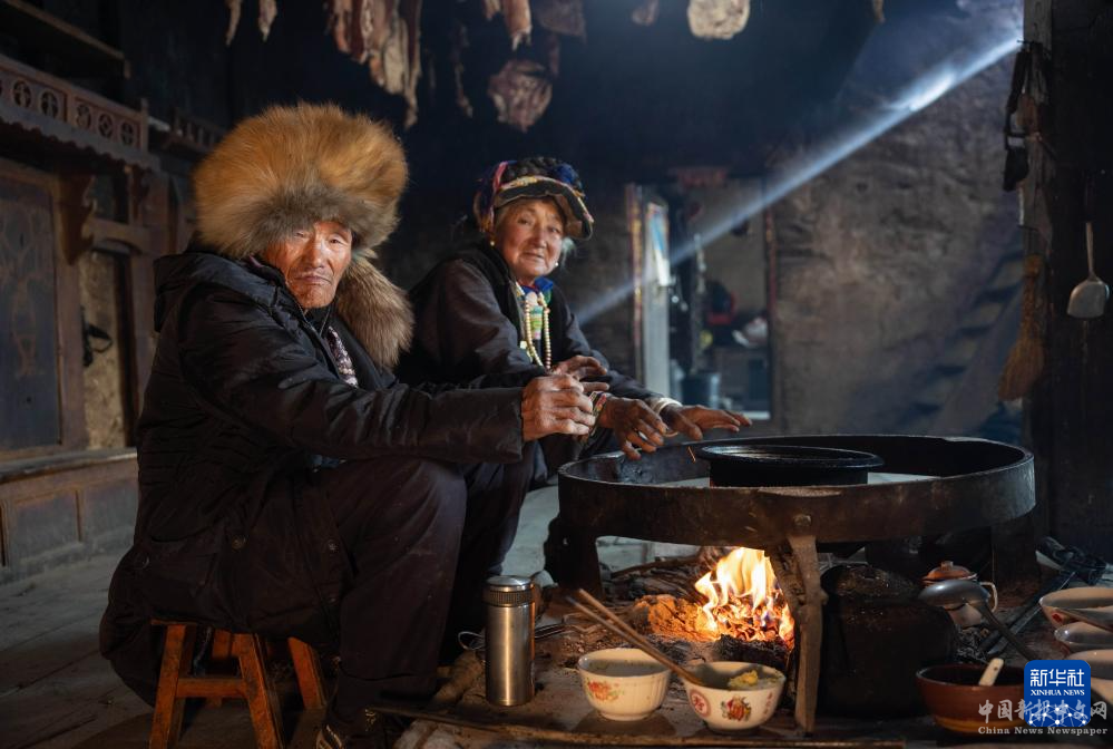 1月10日,在茂县赤不苏镇九龙村,77岁的刘兴福(左)和老伴王办得章在传统羌族老屋里烤火。