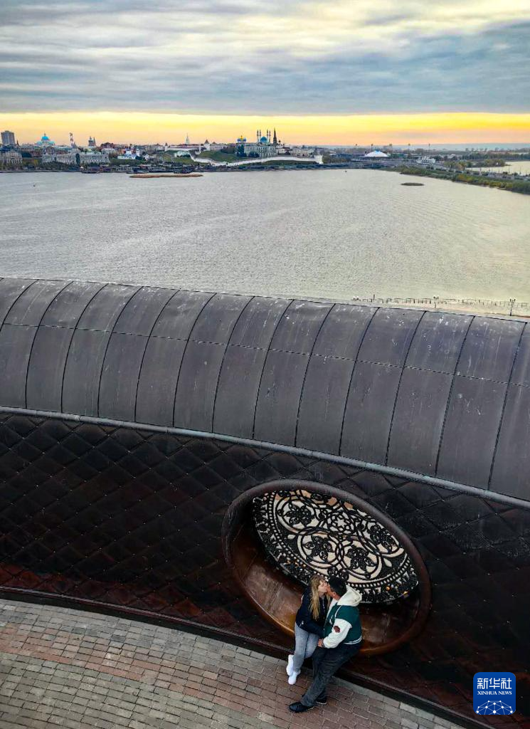 10月20日,一对情侣在俄罗斯喀山“家庭中心”观光平台留影。