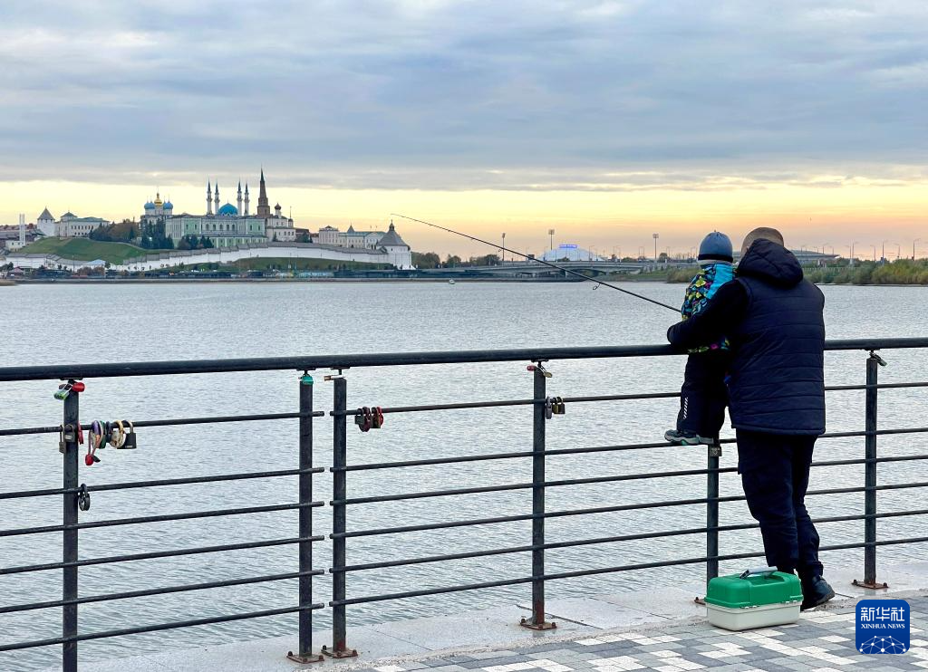 10月20日,在俄罗斯喀山“家庭中心”外,一名男子抱着孩子在河畔钓鱼。