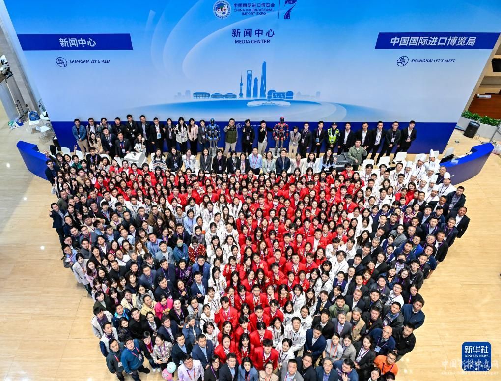 11月10日,来自尼日利亚的参展人员与志愿者在国家会展中心(上海)合影。
