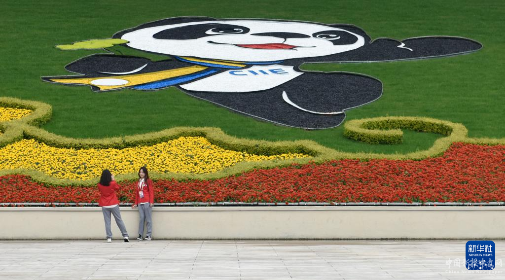 11月10日,人们经过国家会展中心(上海)展馆间的一处进博会标志。