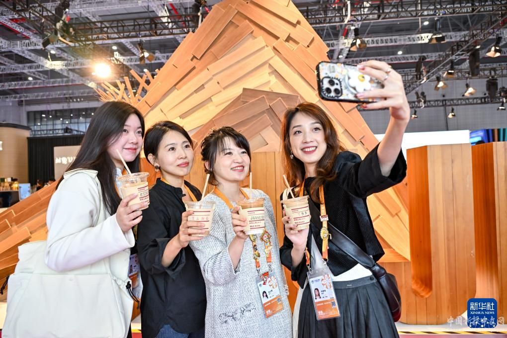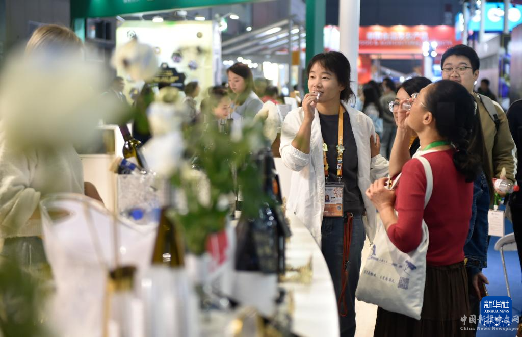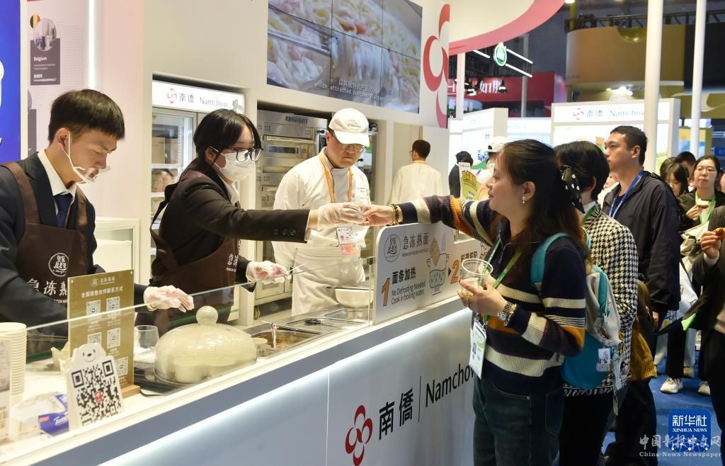 11月10日,参观者在第七届进博会食品及农产品展区品尝饮料。