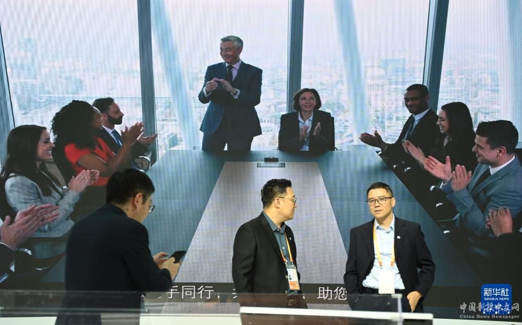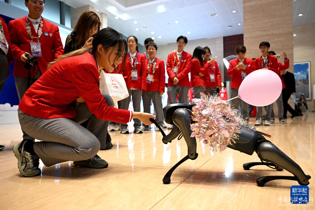 11月10日,志愿者在新闻中心与机器狗握手告别。