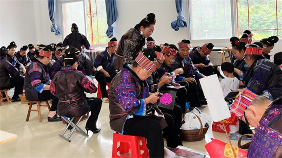 苗族刺绣州级传承人邰春花为绣娘们开展刺绣技艺培训,提升其专业素养。
