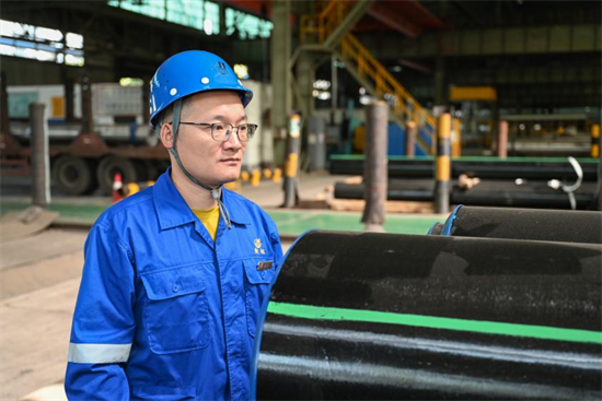 衡钢管线管IPD经理左国锋在现场细致检查深海管线管实物质量。