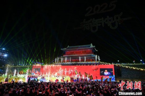 2024年12月31日晚,京津冀三地首次联动举办跨年倒计时活动。图为河北石家庄正定古城会场。中新社记者 翟羽佳 摄