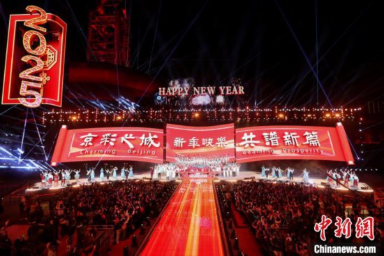 2025年1月1日零点,中国书法家协会副主席张继书写的“新年快乐”“京彩之城 共谱新篇”以卷轴方式展开,现场鼓乐齐鸣,三地民众共同迎来了崭新一年。
