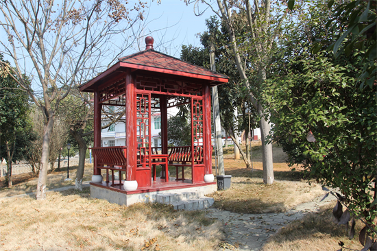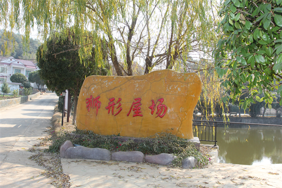 沿着一条笔直的水泥路,我们直抵目的地——狮形组的文化广场。眼前的一切让我们兴奋不已。绿树成荫,屋舍俨然,一块金黄色的巨石静静地卧在村口,石头上刻着四个红色的大字——“狮形屋场”。下了车,我们便迫不及待地漫步在这座小公园里。公园依山而建,亭台楼阁、绿树鲜花、广场舞台、水榭石桌……一应俱全、错落有致。