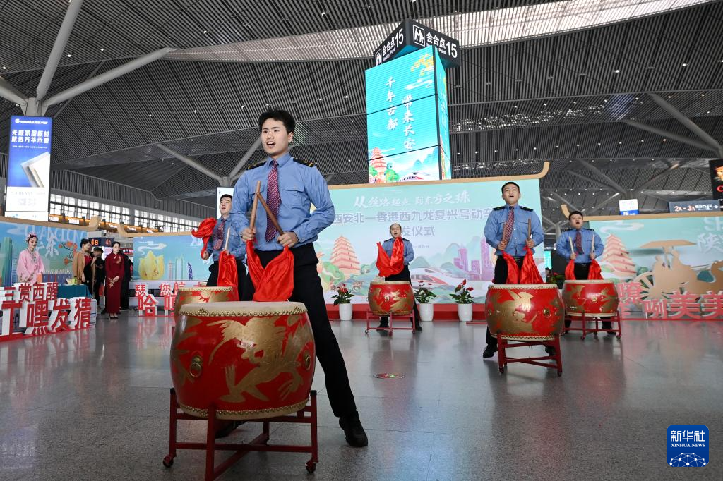 1月5日,在西安北站候车大厅,铁路工作人员在西安北至香港西九龙复兴号车首发仪式上为旅客表演。