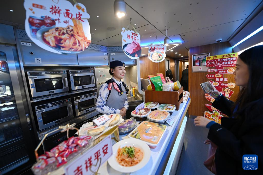1月5日,担当陕港列车值乘任务的“长安之馨”西港乘务人员为旅客介绍餐车服务情况。
