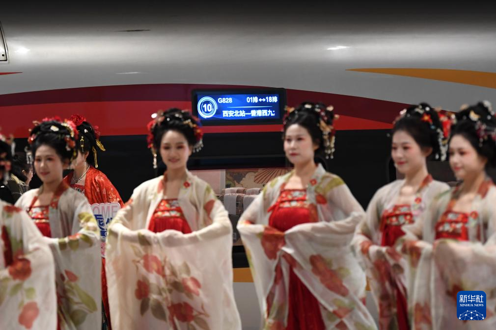 1月5日,在西安北站,身穿汉服的铁路工作人员在西安北至香港西九龙复兴号动车首发仪式上为旅客表演。