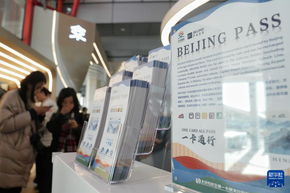 在北京首都国际机场T3航站楼的“北京服务”机场服务点展示的“BEIJING PASS”卡,该卡可用于外籍人士乘坐公交车、地铁,在北京多个文旅景区购票和商超购物中使用(1月8日摄)。