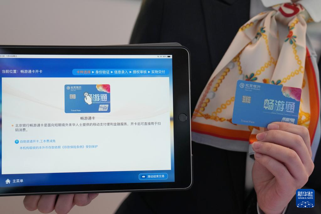 1月8日,在北京首都国际机场T3航站楼的“北京服务”机场服务点,一名北京银行的工作人员在展示面向短期境外来华人士提供的“畅游通”卡,该卡可便利外籍人士在华购买支付。
