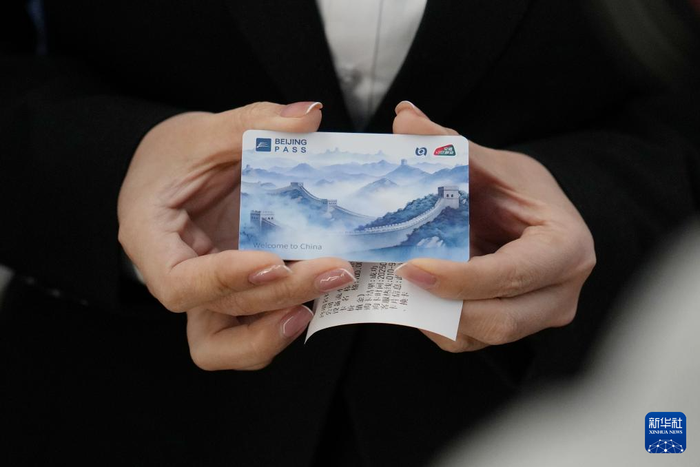 1月8日,在北京首都国际机场T3航站楼的“北京服务”机场服务点,一名工作人员展示为“BEIJING PASS”卡充值。该卡可用于外籍人士乘坐公交车、地铁,在北京多个文旅景区购票和商超购物中使用。