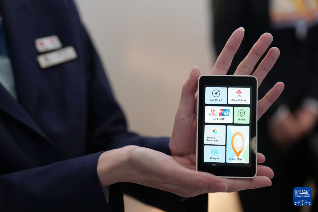 1月8日,在北京首都国际机场T3航站楼的“北京服务”机场服务点,一名中国联通的工作人员在展示一款集成了通信、支付等多种功能的便携终端。