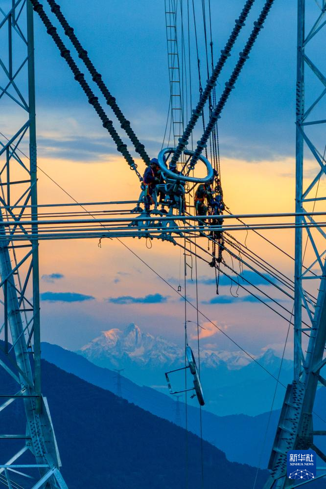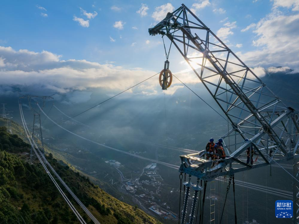 2024年10月14日,在四川省甘孜藏族自治州泸定县,施工人员在川渝1000千伏特高压交流工程进行附件安装作业。新华社发(田海 摄)