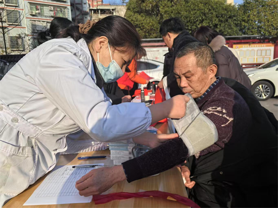 医护人员为居民测量血压、提供健康咨询。(伍浩程 供图)