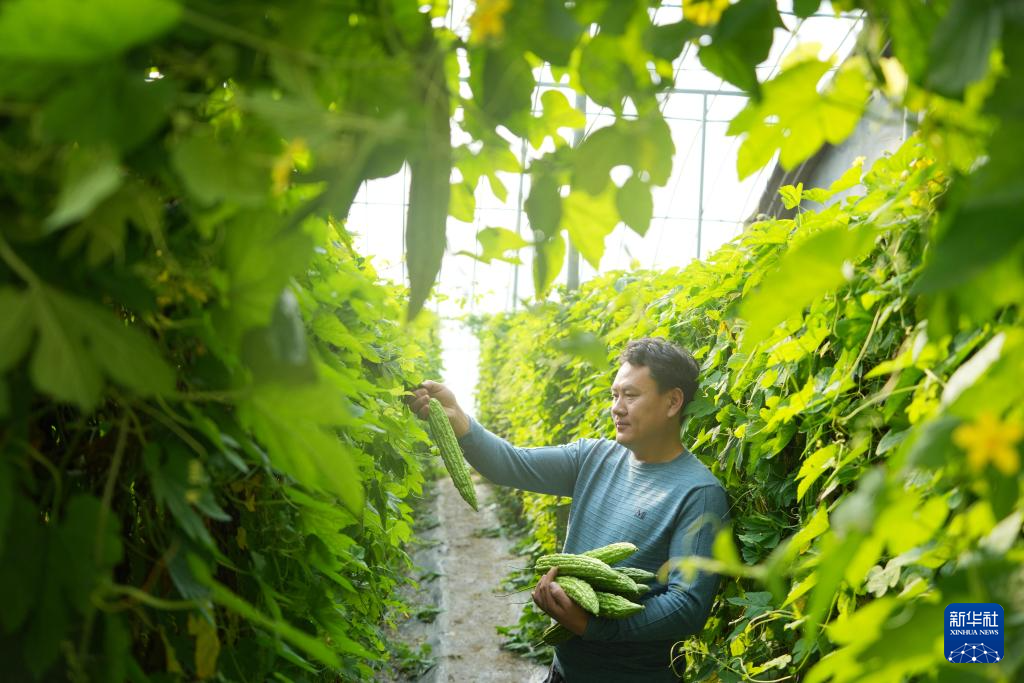 1月21日,在寿光市孙家集街道,蔬菜种植户在收获苦瓜。