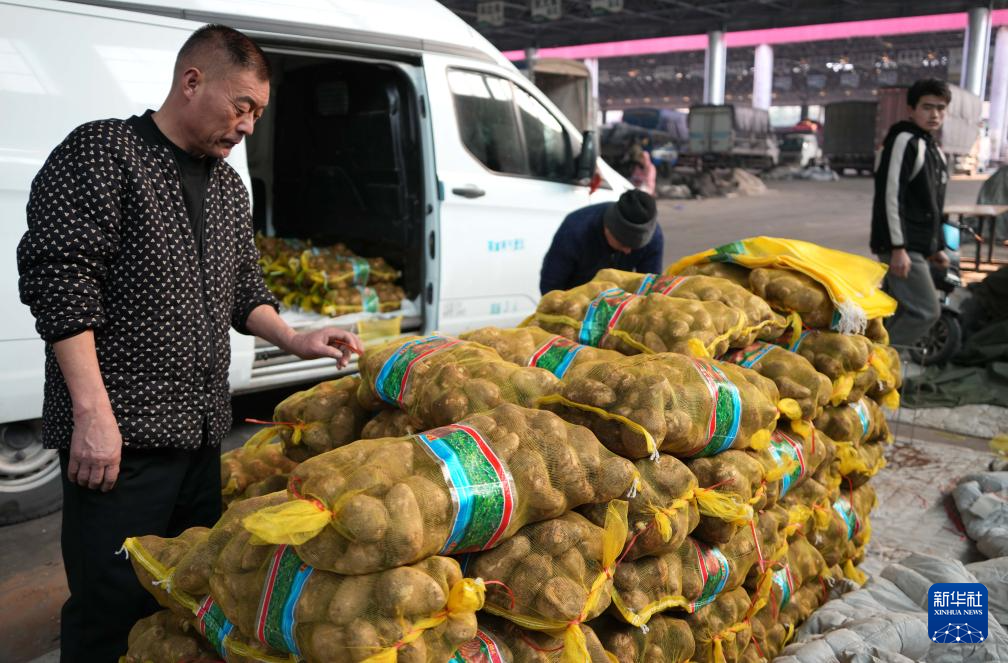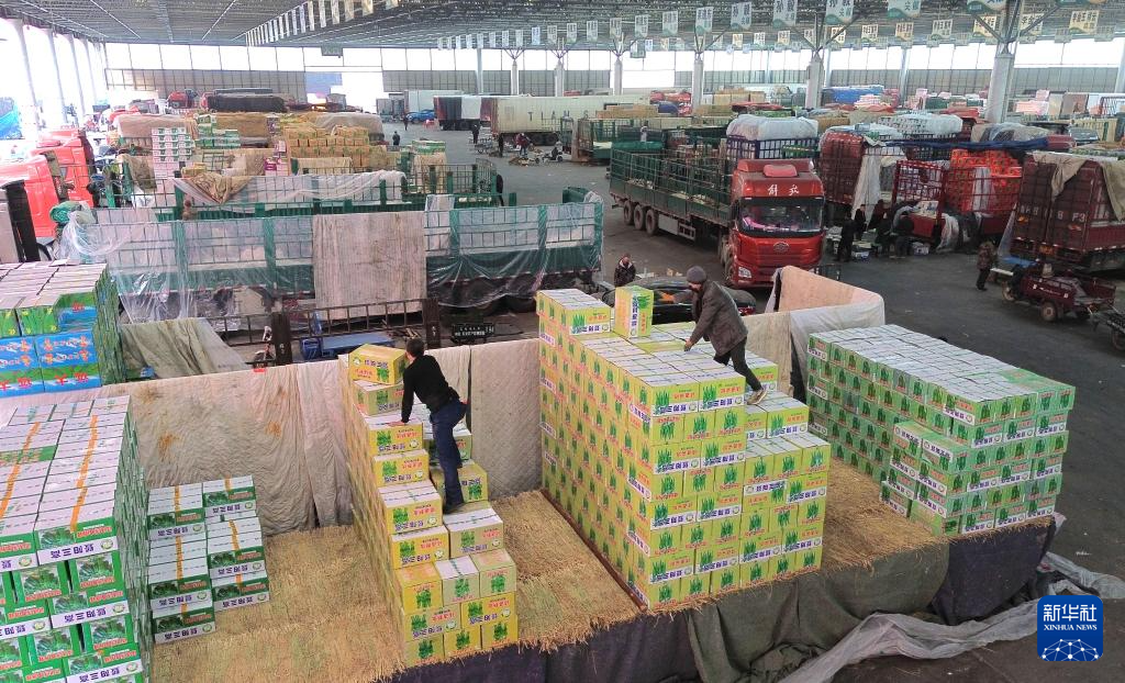 1月22日,在位于山东省寿光市的寿光地利农产品物流园,工作人员在装运蔬菜。
