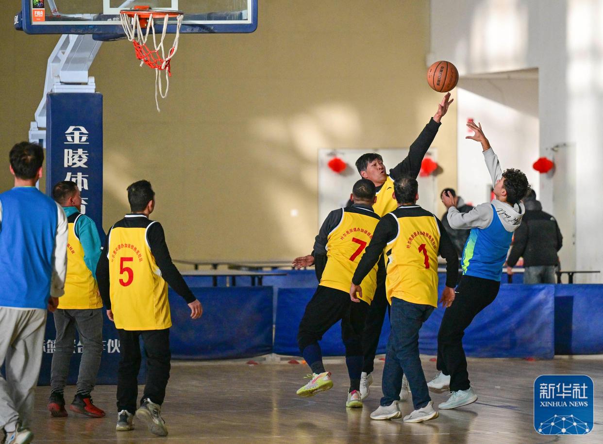 ↑在莎车县2025年“群众村晚”体育中心点位,叶尔羌街道社区代表队进行篮球比赛(1月23日摄)。