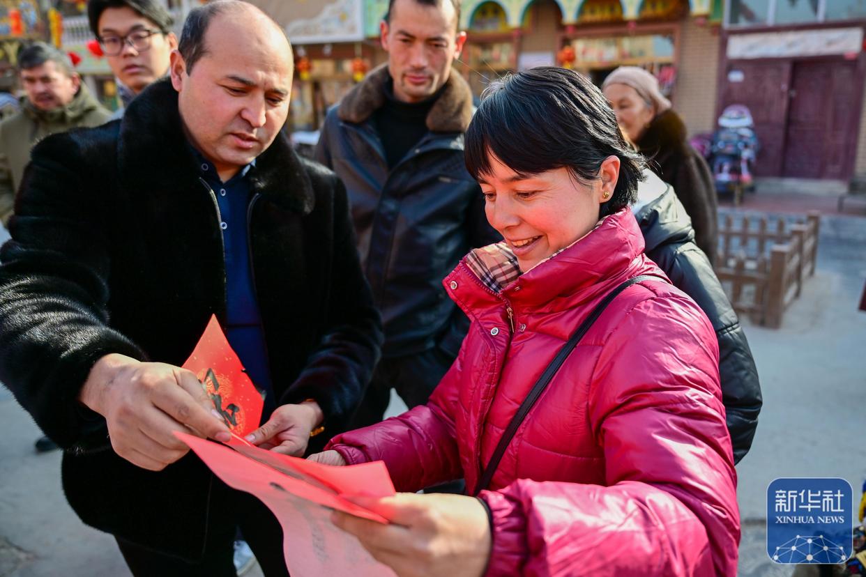 ↑在莎车县2025年“群众村晚”喀赞其街点位,当地群众在活动现场领取春联(1月22日摄)。