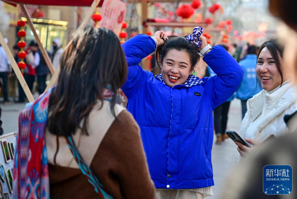 ↑在莎车县2025年“群众村晚”喀赞其街点位,当地群众在艾德莱斯展位上挑选饰品(1月22日摄)。