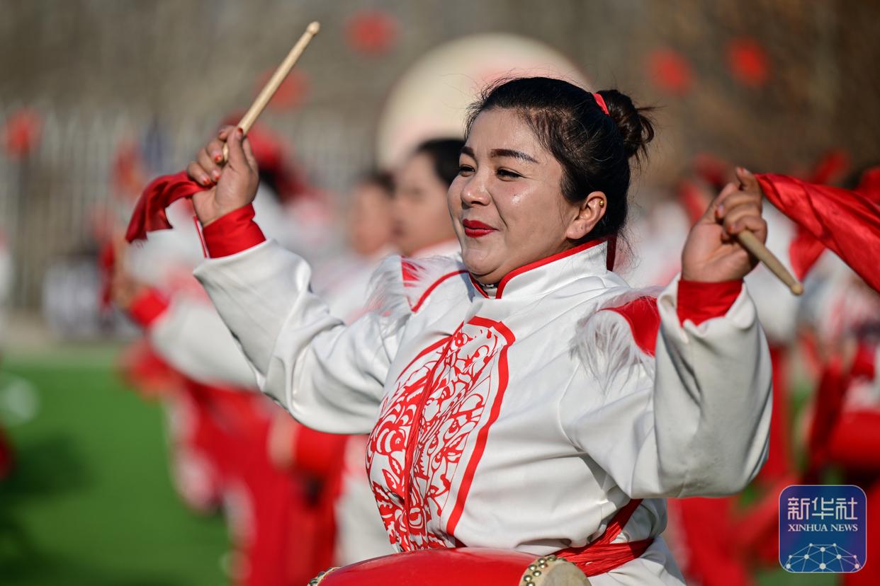 ↑在莎车县2025年“群众村晚”乌达力克镇分会场,当地群众表演安塞腰鼓(1月22日摄)。