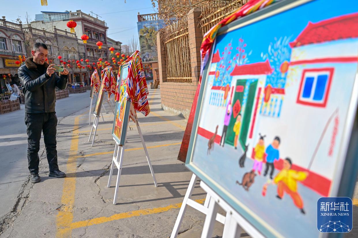 ↑在莎车县2025年“群众村晚”喀赞其街点位,当地群众拍摄展出的农民画(1月22日摄)。