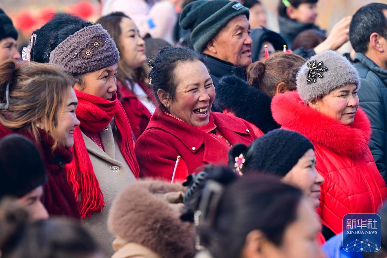 ↑在莎车县2025年“群众村晚”艾力西湖镇分会场,当地群众观看文艺演出(1月22日摄)。