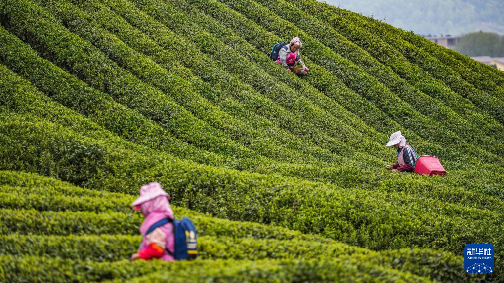 茶农在贵州省安顺市西秀区双堡镇山京茶场采茶(2025年4月4日摄,无人机照片)。