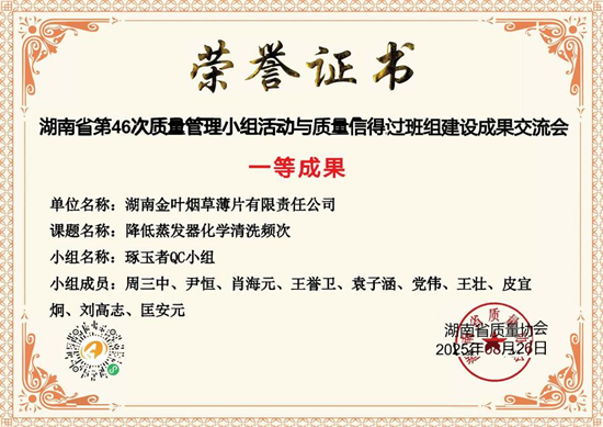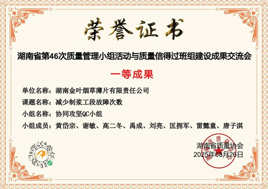 中国新报讯(特约记者 邓小山 通讯员 匡海俫 谭小荣 记者 符秋祖)近日,从2025年湖南省第46次质量管理小组活动与质量信得过班组建设成果交流会传出喜讯,湖南金叶烟草薄片有限责任公司选送的两个课题皆荣获一等成果奖。