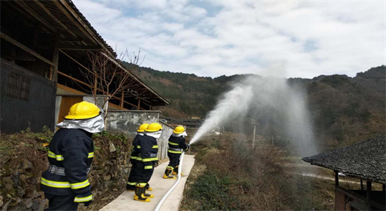 凉伞镇与青溪镇辅警在美岩村共同开展边界团寨消防演习 杨海林摄