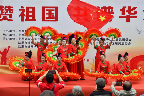 9月26日是,贵州省凯里市洗马河街道,一社区文艺队在表演舞蹈庆华诞。(杨仁海 摄)