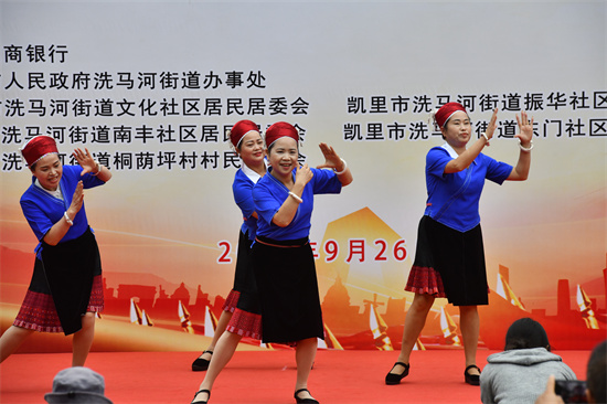 9月26日是,贵州省凯里市洗马河街道,一社区文艺队在表演少数民族舞蹈庆华诞。(杨仁海 摄)