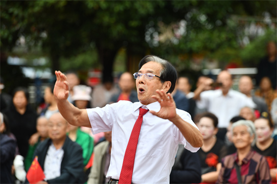 9月26日是,贵州省凯里市洗马河街道,一社区文艺队老人在指挥乐器合奏庆华诞。(杨仁海 摄)