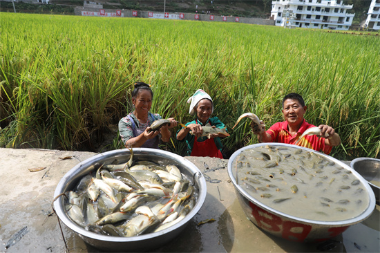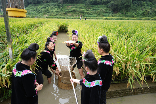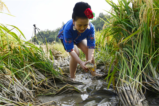 村BA的故乡台江县台盘乡阳芳村在优质稻米田中养稻花鱼,每年秋季收割前都要开田捉鱼,村民脸上充满了喜悦之情-