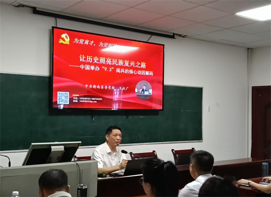 观看阅兵回放后,县委党校教育长、机关支部副书记王从广围绕“今天,我们为什么需要九三大阅兵”主题为全体与会人员作了题为《让历史照亮民族复兴之路——中国举办“9.3”阅兵的核心动因解码》的专题党课。党课从历史纪念、现实警示与未来展望三个维度,系统阐述了中国隆重举行9.3大阅兵的核心动因。一是纪念历史胜利的庄严仪式。党课明确强调,80年前中国人民经过长达14年艰苦卓绝的斗争取得抗日战争伟大胜利,这是近代以来中国人民反抗外敌入侵第一次取得完全胜利的民族解放斗争。九三阅兵是对这一伟大胜利的最高规格纪念。二是铭记历史、捍卫和平的现实需要。党课深入剖析,当前国际环境下存在的历史虚无主义现象,部分国家歪曲侵略历史、否认战争责任的行为时有发生。“忘记历史就意味着背叛,否认罪责就可能重蹈覆辙。”通过阅兵,正是以国家行为明确表态:历史不容篡改,正义不容否定。三是展示军事实力与道路自信。党课重点分析,本次阅兵受阅武器装备全部为国产现役主战装备,首次亮相的新型装备占比大,其中包含无人智能、水下作战等新型作战力量。中国展示先进战力,是为了宣告捍卫国家主权、安全、发展利益的能力,彰显中国作为负责任大国维护正义与和平的决心。四是凝聚民族共识的战略考量。党课最后指出,九三阅兵是连接过去、现在与未来的精神纽带,将个人记忆升华为国家记忆,强化“中华民族共同体”意识,为应对复杂国际环境提供精神动力。